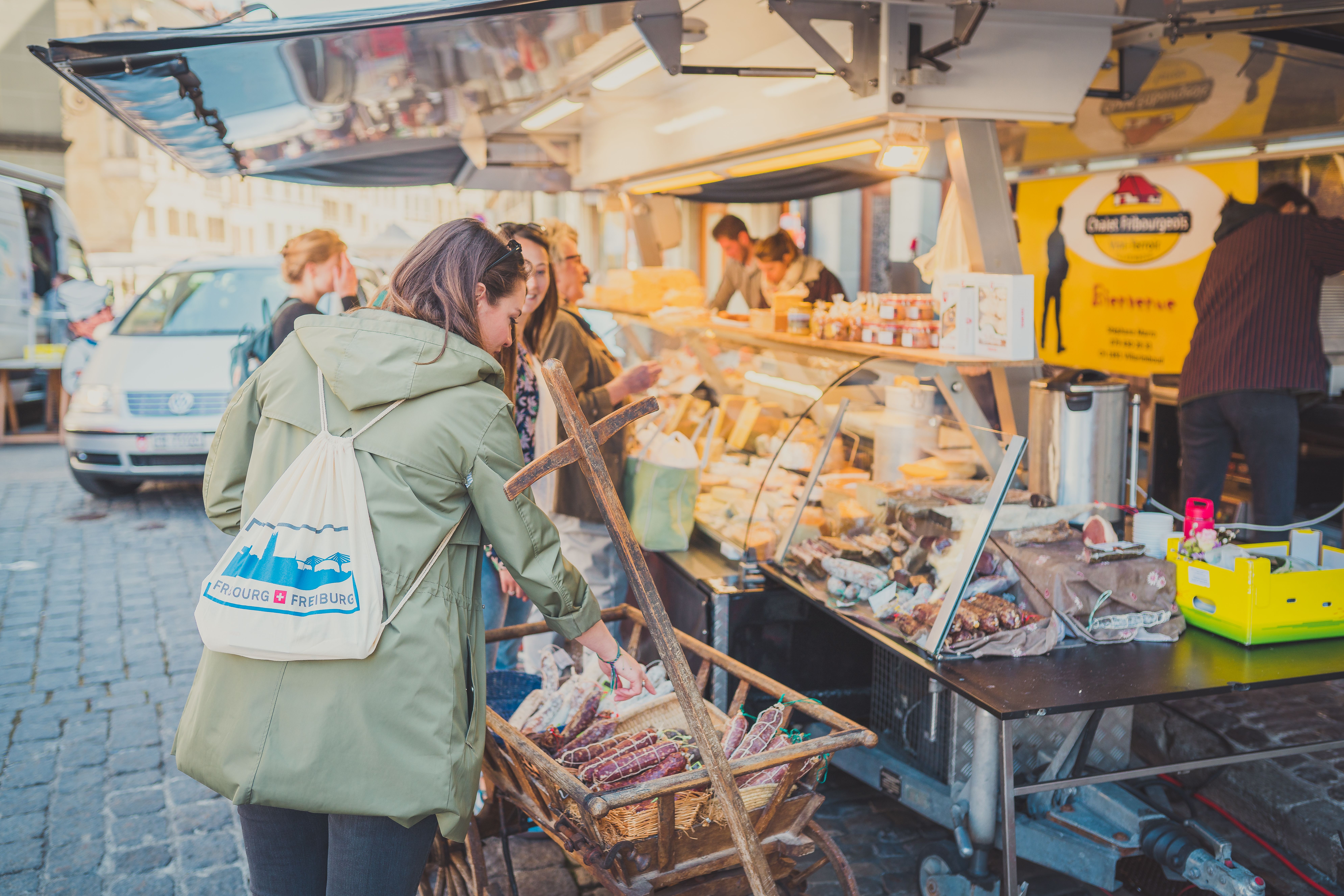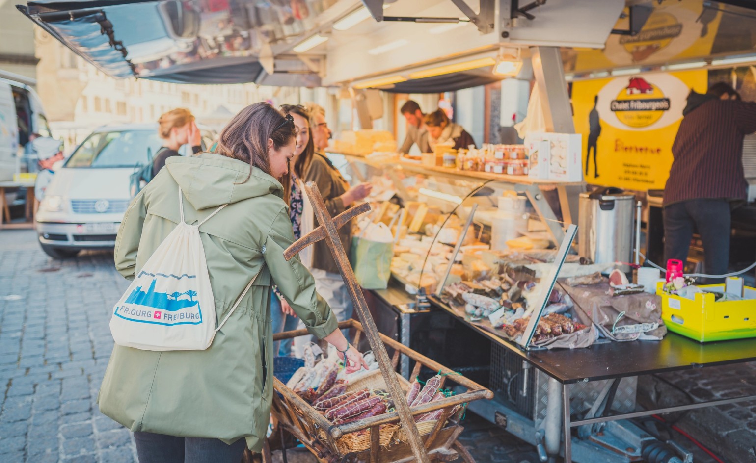 Degustationen auf dem Markt: Cuchaule und Kilbisenf, Jambon de la borne (Chämischinken), Freiburger Saucisson, verschiedene Käsesorten, Zopf, süsse und salzige Bretzeli, Vully-Kuchen, Sirup aus verschiedenen Blüten, Weisswein aus dem Vully.