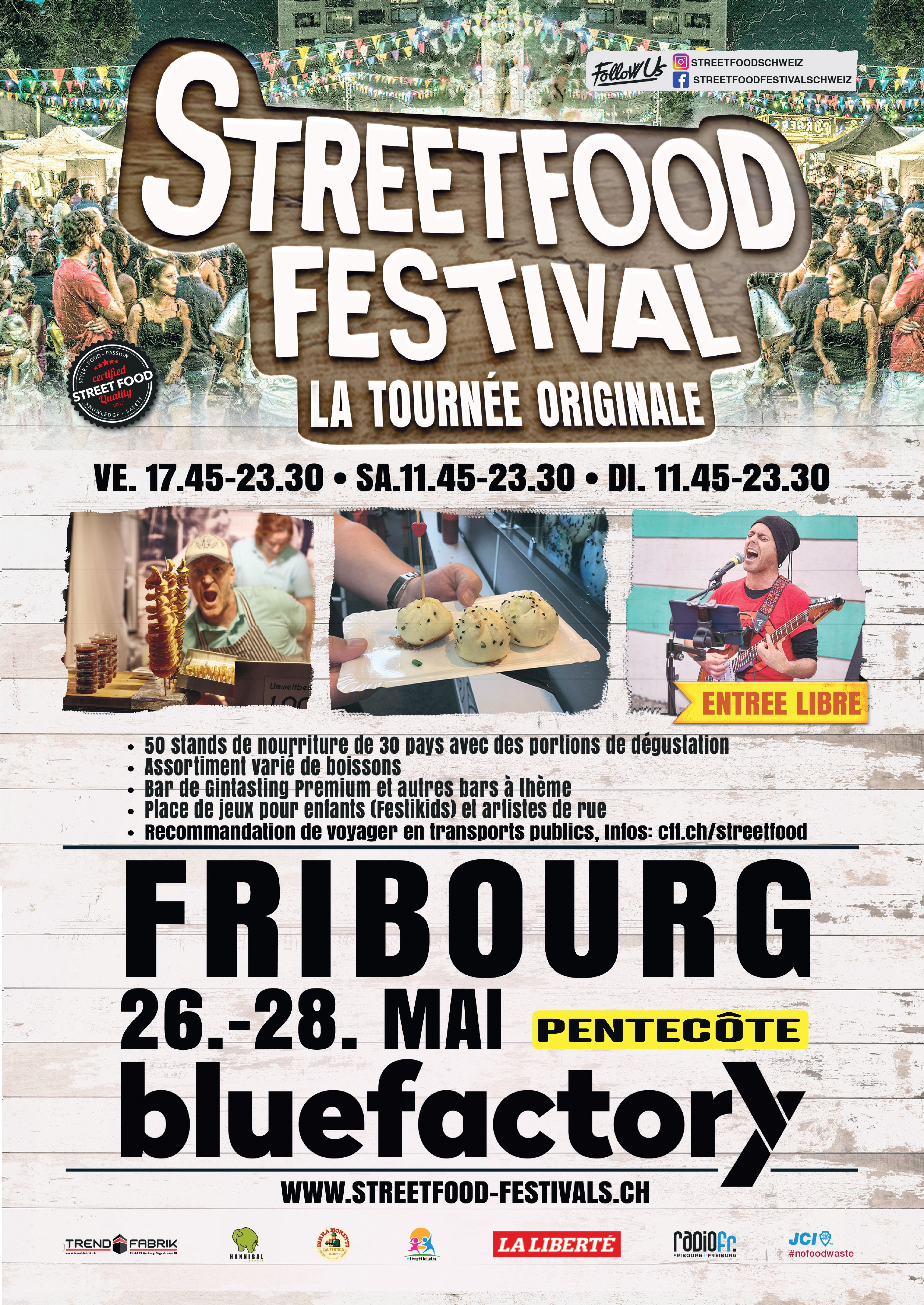 Streetfood Festival Fribourg Die «Original Streetfood Festival Tour» geht bereits in die achte Saison durch die Schweiz. Nach 80 Festivals & unglaublichen 2 Millionen Besuchern findet man den Termin in allen Städten als traditionellen Event in den Agenden. Streetfood steht für die frisch zubereiteten Speisen in mobilen Küchen & ist heute ein fester Bestandteil der Schweizer Gastrokultur. Am Pfingstwochenende vom 26.-28. Mai gastieren wir erstmals in der Stadt Freiburg, auf den Bluefactory Areal. Das urbane & trendige Umfeld ist die Perfekte Location für diesen Genussevent. Hier trifft man die Essenskulturen der Welt in gemütlicher Marktatmosphäre mit 50 Ständen & ohne Flugticket. Die überall erhältlichen, kleinen Probierportionen bieten sich an, neue Speisen zu entdecken & sich auf eine kulinarische Reise zu begeben. Mit kostenlosem Eintritt & dem Kinderland, wird der trendige Anlass zum Volksfest für jede Altersgruppe. Zum Erlebnis gehören aber auch verschiedene Themenbars wie Apéro-, Wein-, Beer- & Premium Gintasting dazu. Bunte Lichterketten, schön dekorierte Gelände, Musiker sowie genügend Sitzplätze machen den Event zum Happening. Egal ob die Sonne scheint oder es regnet, wettergeschützte Bereiche sind immer vorhanden & sorgen für ein gemütliches Beisammensein. Auch dieses Jahr sorgt JCI #nofoodwaste wieder dafür, dass möglichst wenig Lebensmittel verschwendet werden & verteilen die übriggebliebenen Lebensmittel an Bedürftige! Die Anreise wird mit ÖV empfohlen.